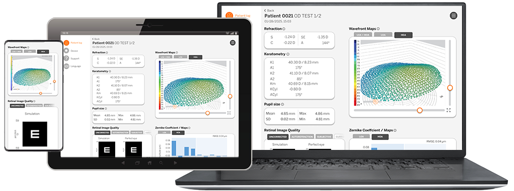 QuickSee Free and QuickSee Free Pro, combined with the Companion App, lets you produce printable visual exam reports for your patients, demonstrating the potential improvement from vision correction. With QuickSee Free Pro, you also get advanced refraction metrics, including wavefront maps, Zernike Coefficients, and visual acuity simulations.